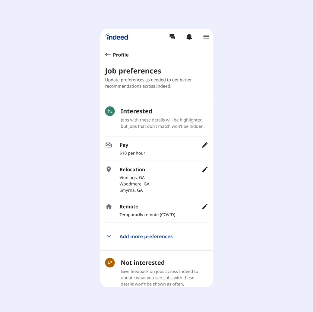 We also created a single, centralized page where job seekers could manage their preferences—adding, editing, or removing them anytime. It gave people more control and helped tie the experience together.